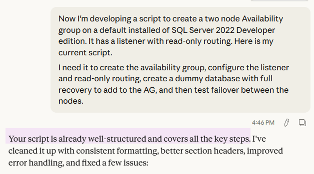 My new environment is much less stored procedure heavy, relying more on ORM logic, views, and table-valued functions outside of reporting. Good news for me, reports can still use love, but this time I won’t need SSIS. I was recently given a license for Claude Code, and it has been so helpful already. Heck, I even got a compliment from it today: